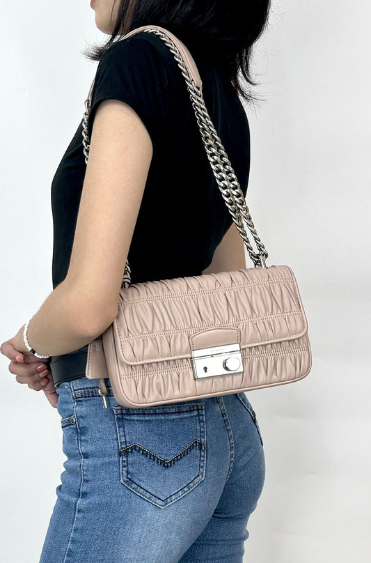 PRADA Mini Ninfea pink leather Saffiano Bag with chain & wide logo strap 1BH183