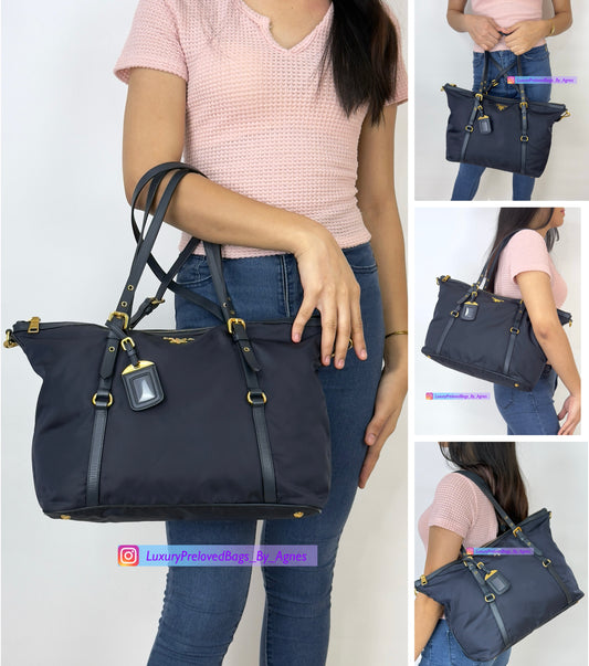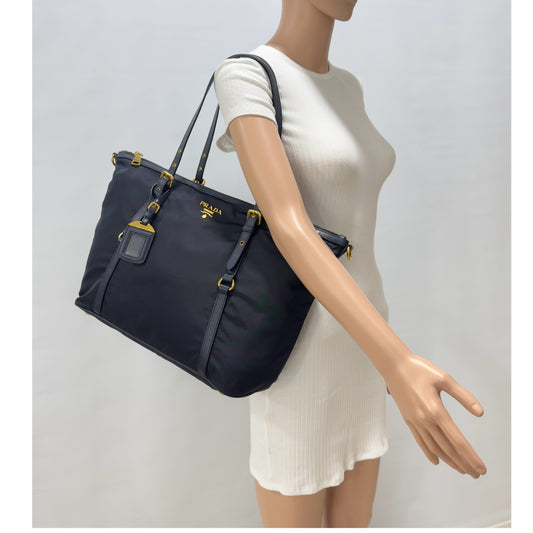 Prada Navy Blue Tessuto Nylon And Saffiano Leather Tote Bag